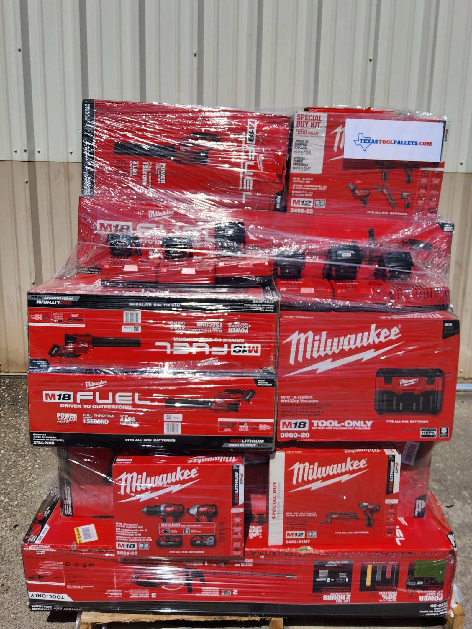 Chaque palette contient exclusivement des outils Milwaukee neufs, jamais utilisés, scellés en usine et livrés avec leurs accessoires d’origine.
